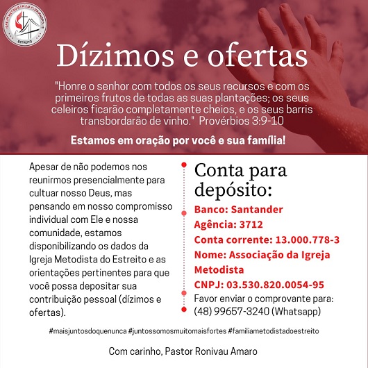A Igreja Metodista entende como contribuições regulares de seus membros os Dízimos e as Ofertas para a manutenção da Missão de Deus por meio dos seus Ministérios.